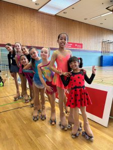 Aber nun zu den sportlichen Höhepunkten: den Anfang machten am Samstag die Minis. Alle drei lieferten gute und flotte Programme ab. Platz 3 für Lea Rapp, dicht gefolgt von Lina Löffler auf Platz 4 und Faina Hopp auf Rang 5 waren wieder einmal ein toller Erfolg für dieses junge Team.